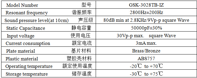 產(chǎn)品名稱(chēng): 壓電式無(wú)源蜂鳴器 30mm 2.8KHz插針