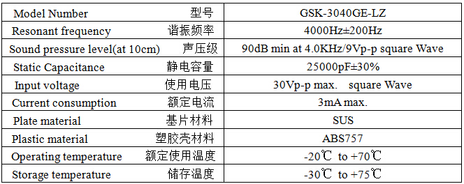 產(chǎn)品名稱: 壓電式無源蜂鳴器 30mm 4.0KHz引線